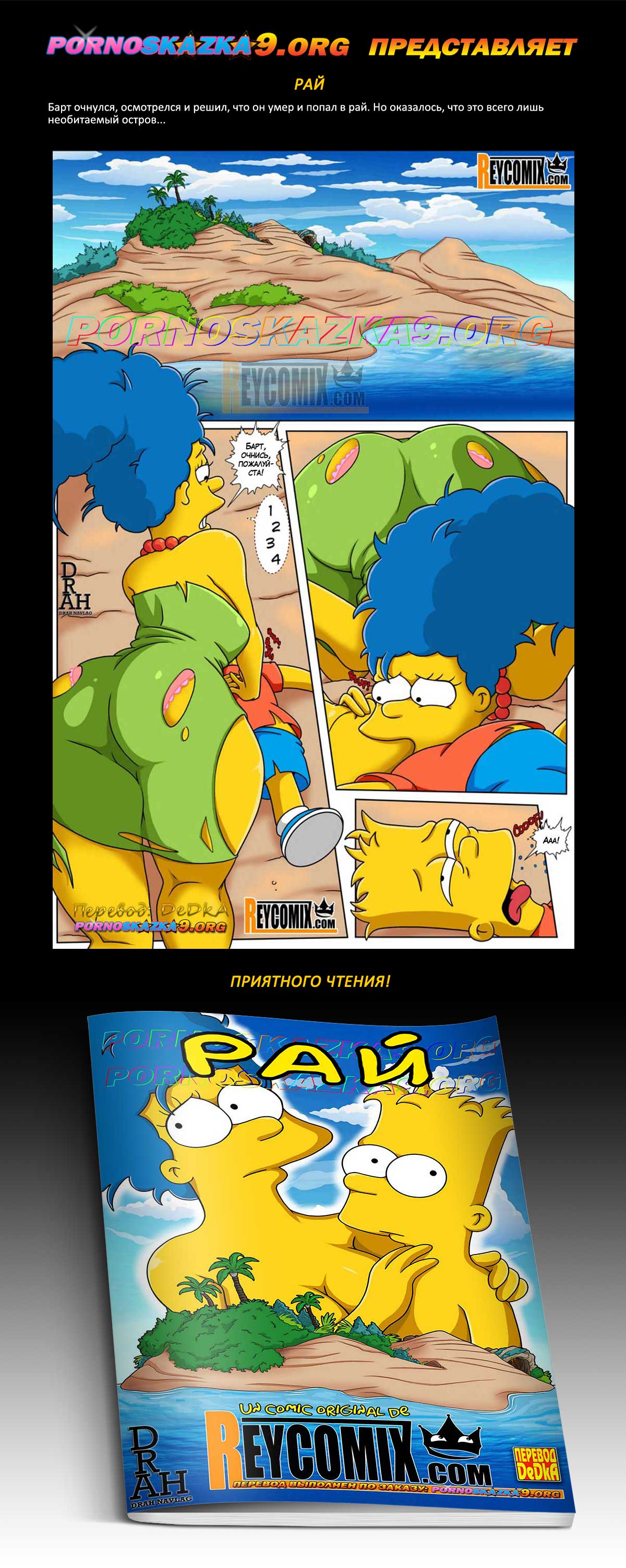 Порно комикс «Рай. Симпсоны». Барт очнулся, осмотрелся и решил, что он умер и попал в рай. Но оказалось, что это всего лишь необитаемый остров…